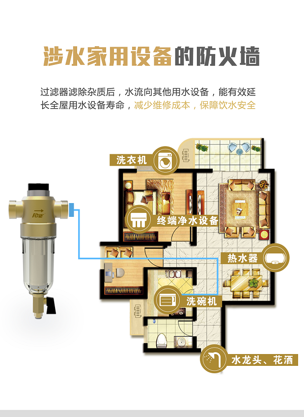 1、同正前置過濾器/同正反沖洗前置過濾器,超強過濾性能,可有效攔截水中的雜質(zhì)、泥沙、鐵銹、蟲卵等污染物,守護全屋用水第一關(guān)。